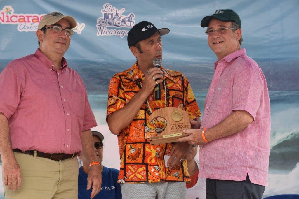 Fernando Aguerre presidente de la Asociación Internacional de Surf entregó una placa de reconocimiento a Roberto Zamora Llanes, presidente de Grupo Lafise y de esta manera agradeció el apoyo que