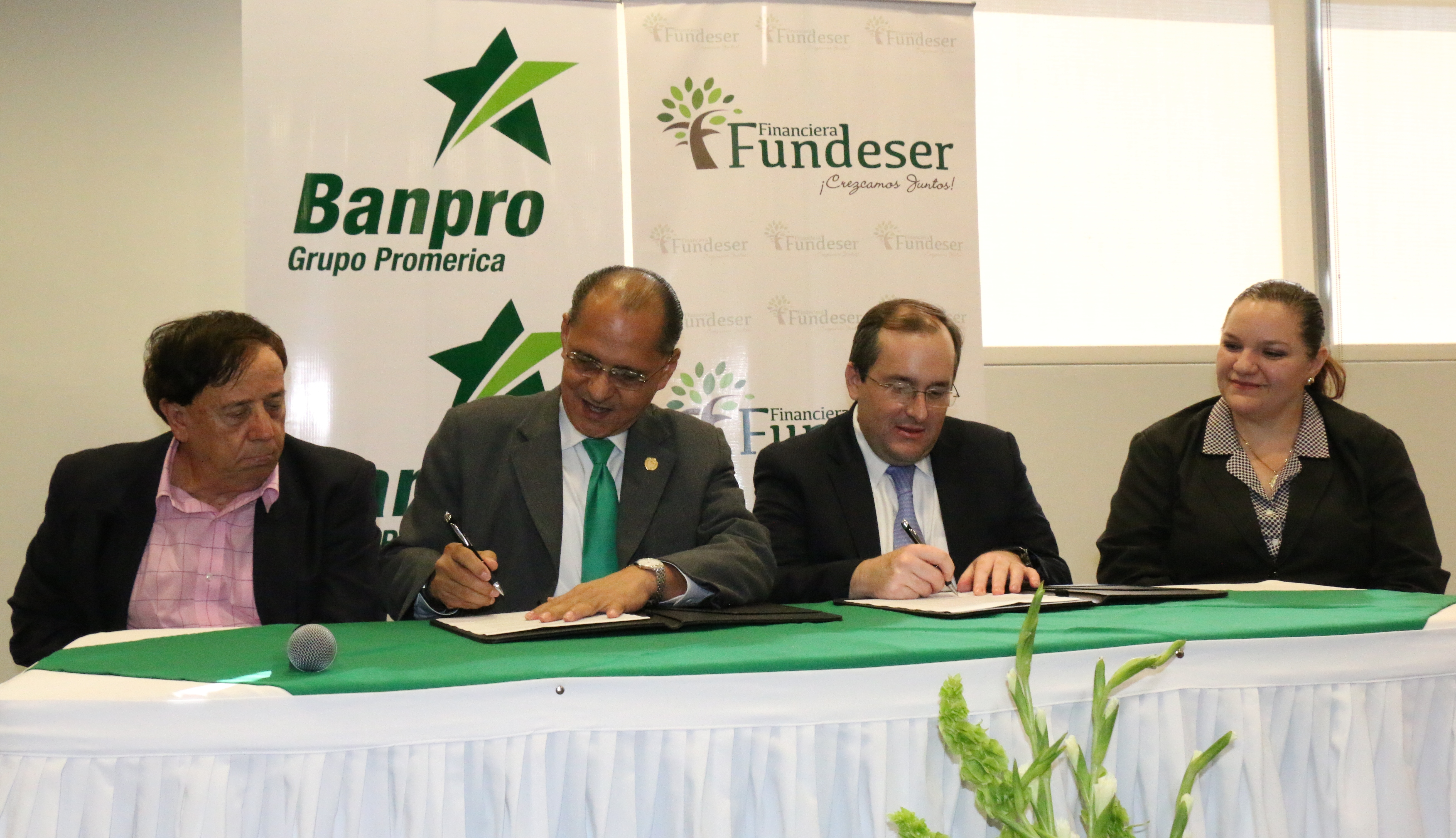 Financiera Fundeser y Banpro Grupo Promerica suscribieron un convenio para que las 27 sucursales a nivel nacional de esta financiera formen parte de la amplia red de Agentes Banpro, para