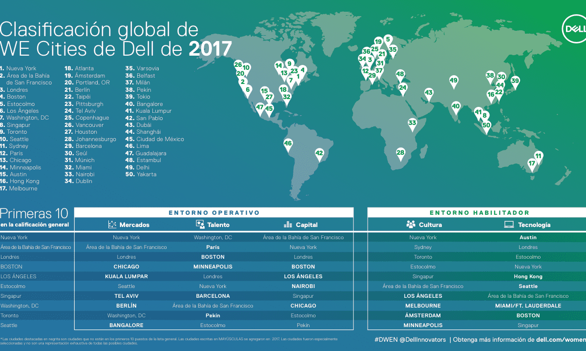 En la octava conferencia anual de la red de mujeres emprendedoras de Dell, Dell anunció las conclusiones del índice 2017 Women Entrepreneur Cities (WE Cities) Index, que revela cómo las