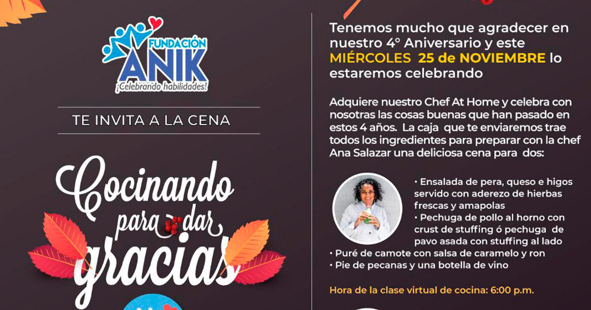 Fundación Anik y la Chef Ana Salazar le invitan a pasar una super noche de deliciosa comida, buen vino y excelente música para dar gracias por todas las bendiciones que