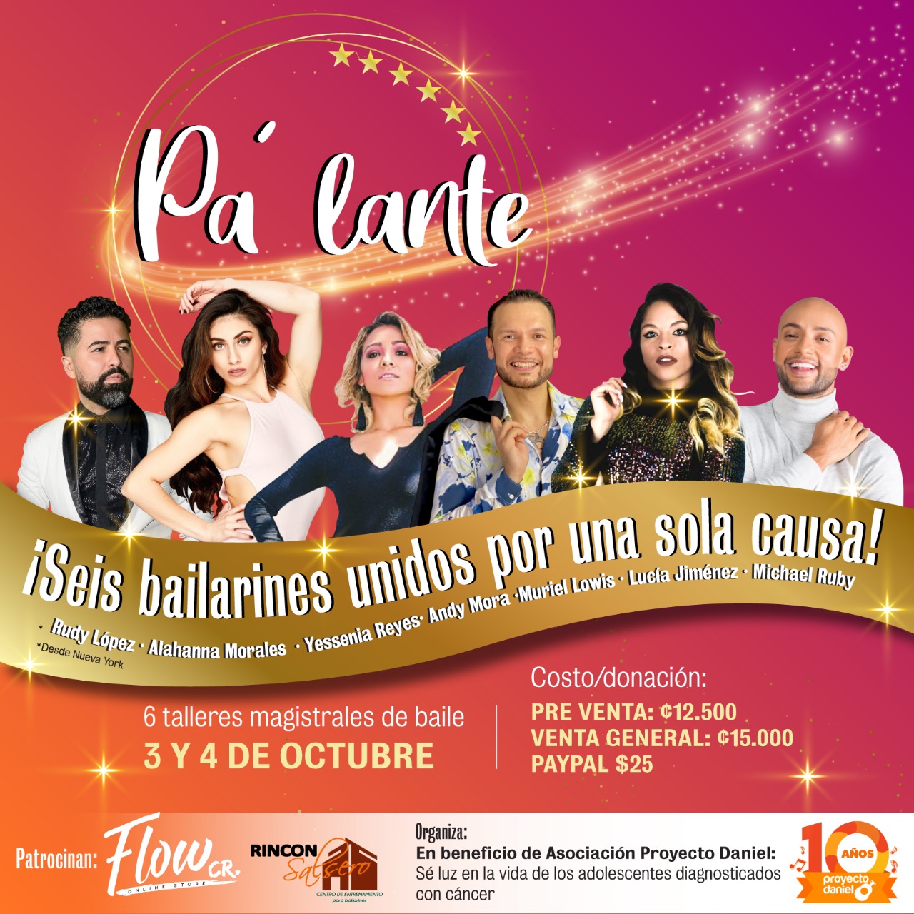 El 3 y 4 de octubre, Yessenia Reyes, Andy Mora, Alhana Morales, Michael Rubí, Muriel Lowis y Rudy “El Tiguere” Lopez, unirán sus talentos y podrán a bailar a Costa Rica, en Pa´lante, iniciativa con la que Proyecto Daniel continua con su misión de recaudar fondos para ayudar con alimentos a la población adolescente diagnosticada con cáncer.