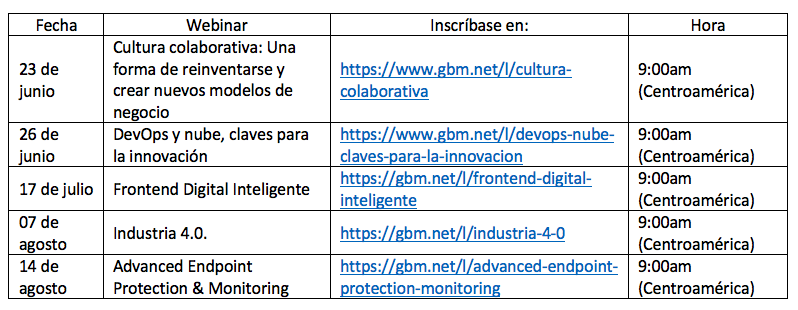 Pensando en la formación adecuada para responder a la nueva normalidad, la empresa GBM enriquece su oferta de servicio y valor, con una serie de charlas y capacitaciones virtuales, que se impartirán sin costo alguno.