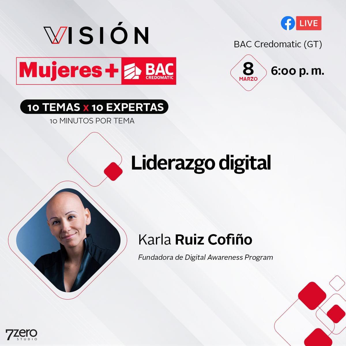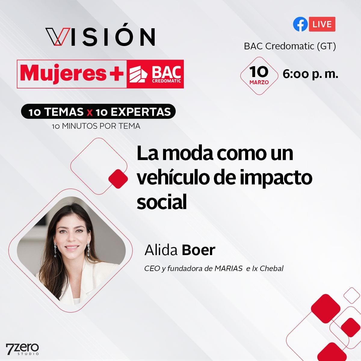 Esta edición del proyecto VISIÓN Mujeres+ 2021 se realizará con el formato 10x10x10, el cual consiste en el desarrollo de 10 temas con 10 expertas y cada una tendrá 10 minutos para desarrollar el contenido.  La actividad se transmitirá a partir de las 6 de la tarde de cada día en la página de Facebook de BAC Credomatic Guatemala.