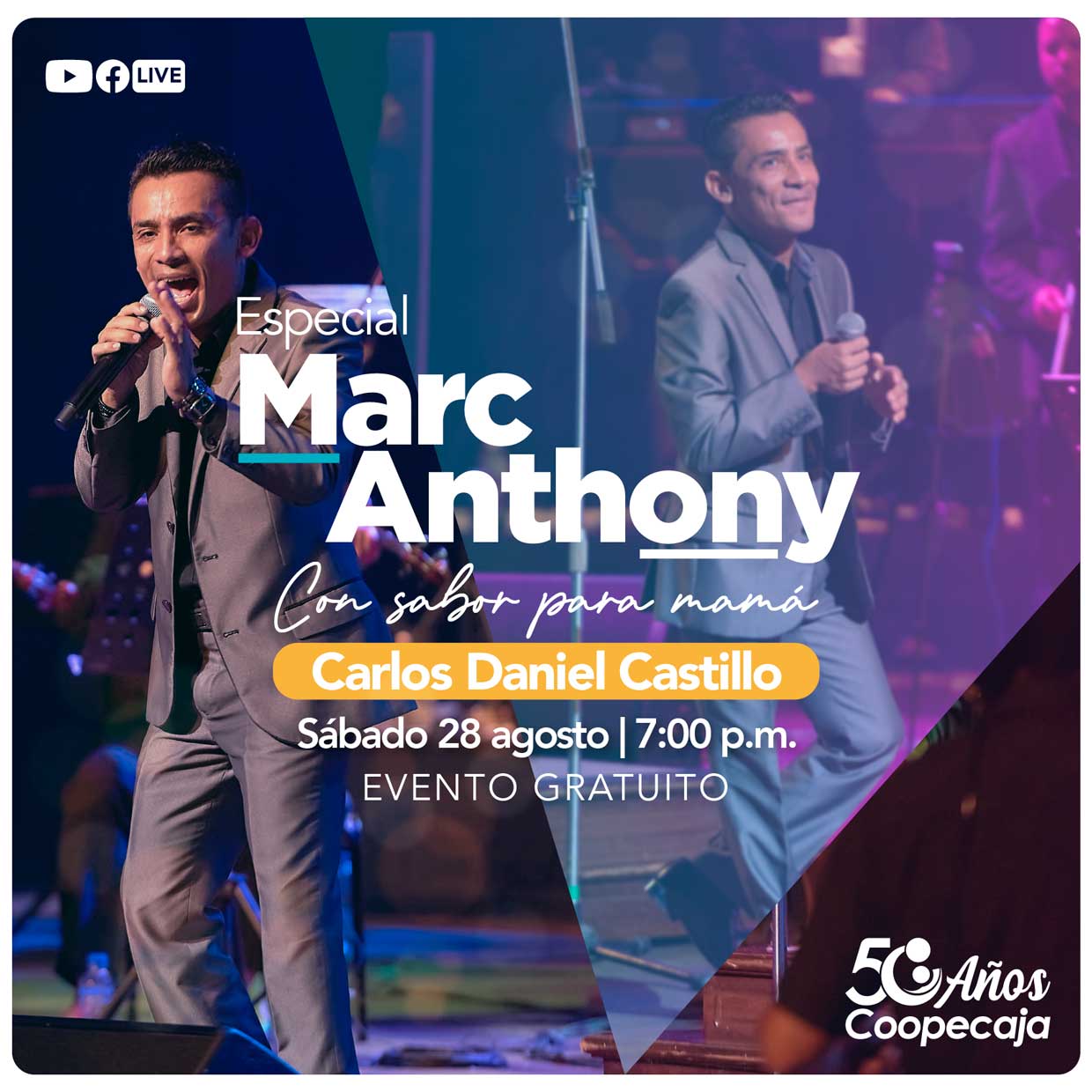 Las mamás, tías, madrinas y abuelas tendrán su noche también, con una velada en la que podrán cantar y bailar sus canciones favoritas del cantante Marc Anthony en la voz del cantante nacional Carlos Daniel Castillo el sábado 28 de este mes a las 7 p.m. a través del Facebook de Coopecaja. Éste es un evento gratuito y creado para que podamos celebrar y disfrutar de una noche tropical en familia con nuestras madres.