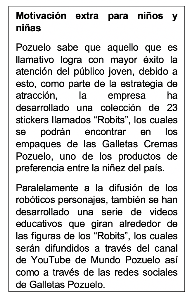 Así, bajo el nombre de “TecnoGame Robits”, Pozuelo ha lanzado un torneo de programación con bases en robótica que involucrará a 400 niños y niñas de todo el país con edades que oscilan entre los ocho y los doce años. La idea es que los participantes tengan acceso gratuito a una capacitación y entrenamiento de cinco días durante los cuales recibirán las bases para crear un videojuego tipo “Arcade”, en el cual los “Robits”, que son más de una veintena de “personajes robóticos” de la campaña de Pozuelo y las Galletas Cremas Pozuelo, serán los protagonistas del entretenimiento que deberán diseñar los chicos y chicas participantes.