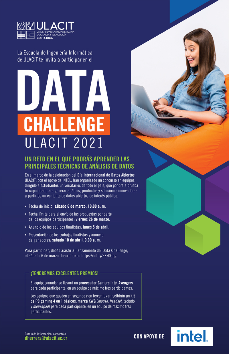 En el marco de la celebración del Día Internacional de Datos Abiertos, el próximo 6 de marzo, ULACIT, con el apoyo de Intel Costa Rica, invita a todos los estudiantes universitarios de Costa Rica a participar en el “Data Challenge ULACIT 2021”. Dicho concurso les permitirá a los jóvenes participantes aprender y ejecutar las principales técnicas del análisis de datos y, además, a optar por magníficos premios.