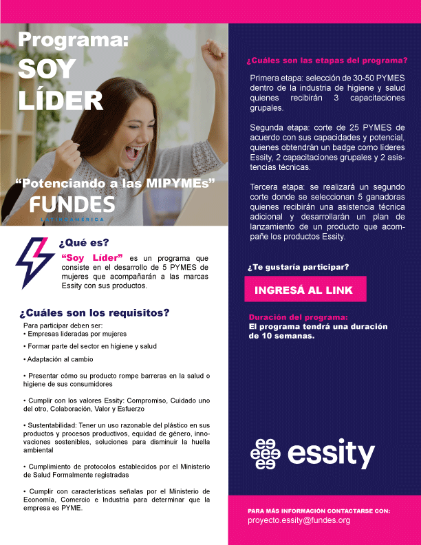 Essity,  se unió con la organización FUNDES, expertos en el desarrollo de la micro, pequeña y mediana empresa, para el desarrollo del programa  “Soy Líder”, con el objetivo de apoyar a las PYMES líderadas por mujeres bajo un esquema hecho a la medida con el fin de recibir una actualización en temas de negocios en tiempos de cambio, bajo la modalidad virtual, a partir del mes de enero.