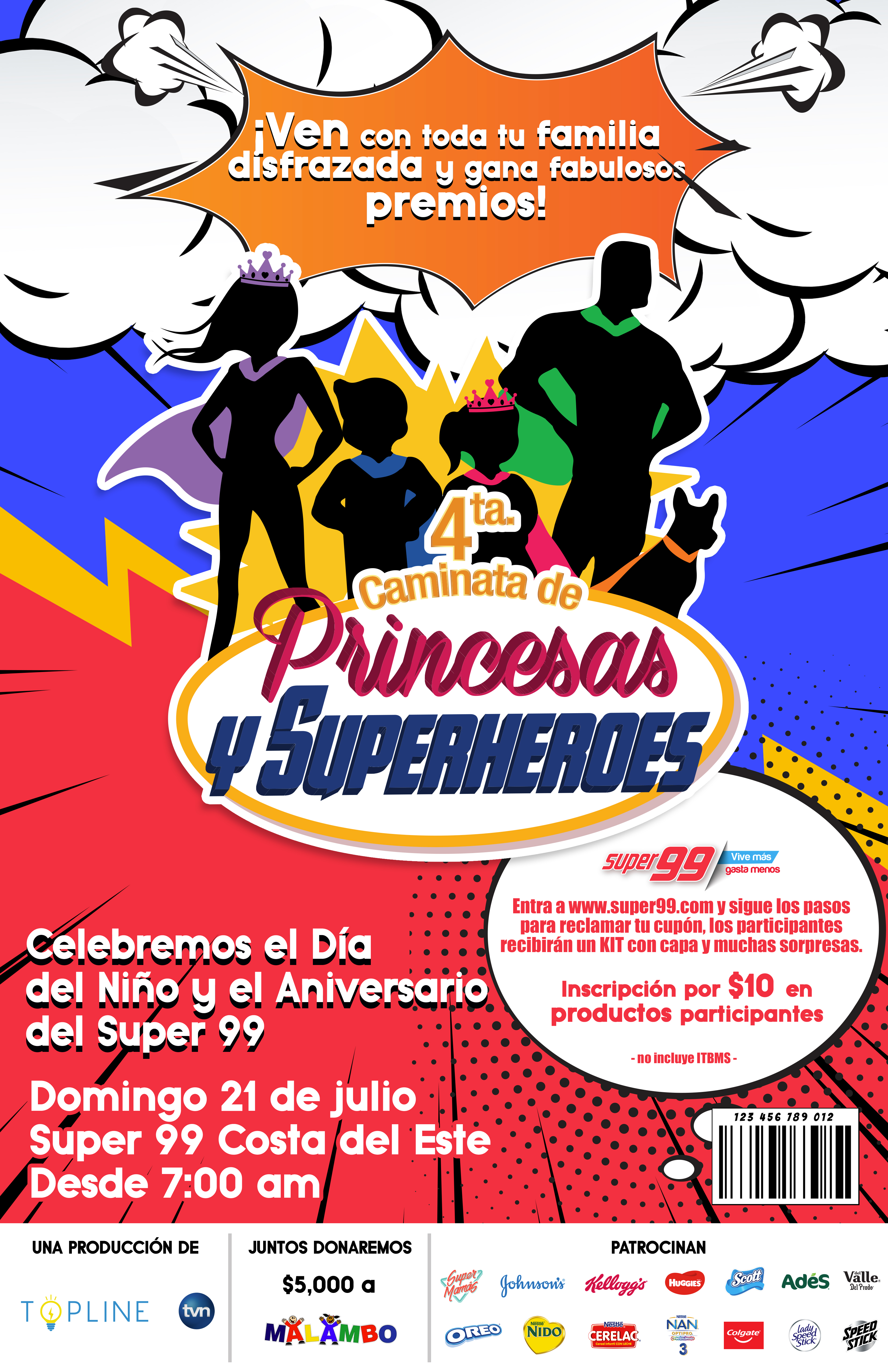 Super 99 en celebración de sus 33 años de aniversario en Panamá y con el propósito de celebrar el día del niño, realiza la 4ta Caminata de Princesas y Superhéroes donde se unen con sus aliados estratégicos y Topline Events para ayudar a los  niños del Hogar Malambo.