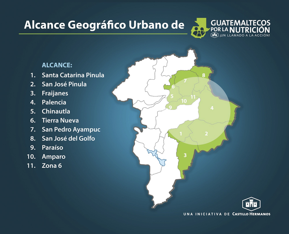 Guatemaltecos por la Nutrición, el programa de abordaje integral a la desnutrición que forma parte de la estrategia de sostenibilidad de Castillo Hermanos, anunció que, ante el incremento de casos de desnutrición aguda en la Ciudad de Guatemala, iniciará operaciones en la zona 2, 6 y 18 de Guatemala y, los municipios de Chinautla, Palencia, San José del Golfo, San Pedro Ayampuc, Fraijanes, Santa Catarina Pinula y San José Pinula.