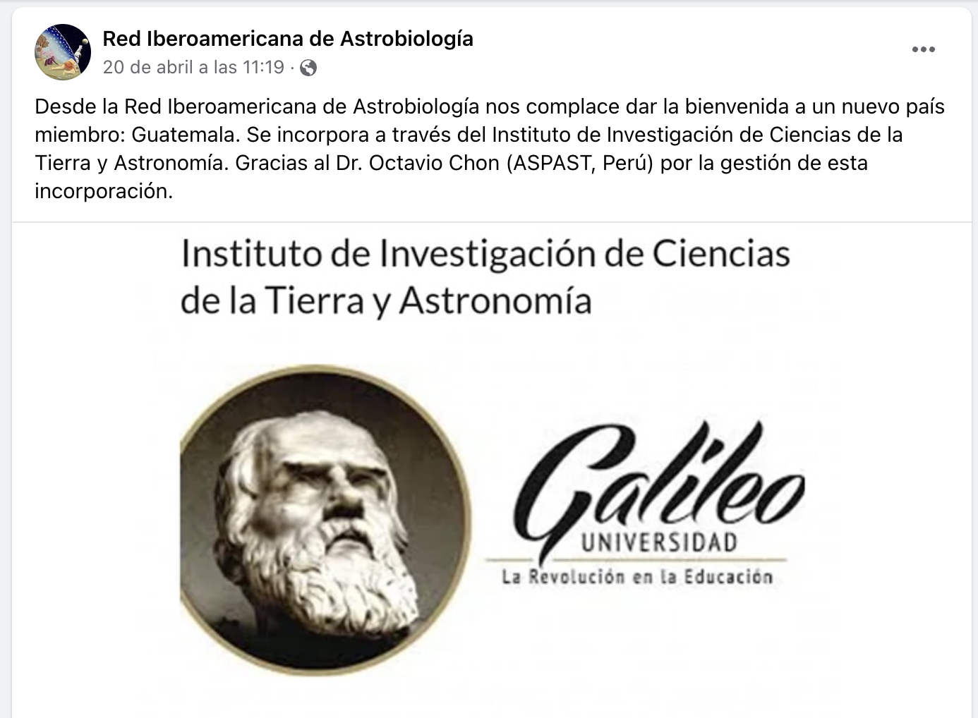 A través del Instituto de investigación de Ciencias de la Tierra y Astronomía (IICTA), de Universidad Galileo, Guatemala fue nombrada como miembro de la Red Iberoamericana de Astrobiología.