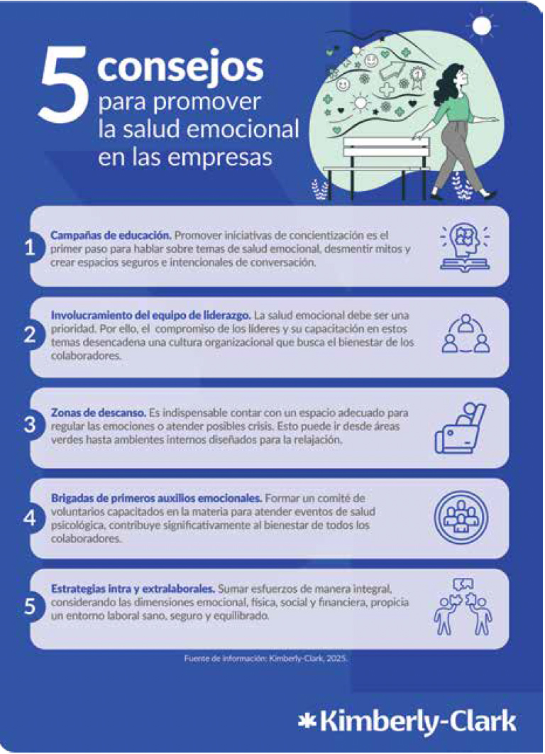 “Contamos con programas totalmente integrales, es decir, que cuidan el bienestar del colaborador, pero que también contemplan a la familia. Asimismo, nos preocupamos por incluir el ambiente intra y extralaboral en todos los esfuerzos de salud emocional. Nuestro abordaje incorpora la parte física, emocional, financiera y social, para generar resultados positivos de manera sostenida en el tiempo”, explica Kathya Campos, gerente de Servicios Médicos Ocupacionales para Kimberly-Clark Latinoamérica.
