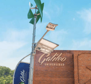 En Universidad Galileo se tienen instalados dos prototipos de un sistema eólico-solar fotovoltaico que actúan de forma simultánea aprovechando el viento y la radiación solar para almacenar energía eléctrica en un banco de baterías e iluminar por las noches dos áreas distintas del campus central. Este aerogenerador de eje vertical aprovecha la fuerza del viento para producir energía eléctrica, su potencia nominal es de 400 W pero integrado a un panel solar fotovoltaico suman ambos 700 W.