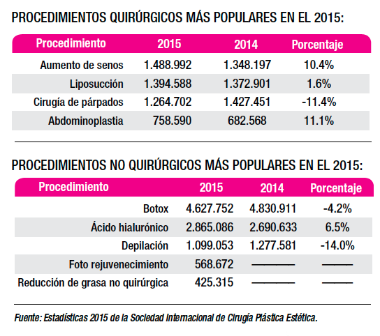 La toxina botulínica, mejor conocida como botox, sigue siendo el procedimiento estético más común para hombres y mujeres, con un total de más de 4,6 millones de procedimientos notificados. Otro popular inyectable, ácido hialurónico, aumentó un 6,5% desde 2014 hasta 2015. En materia de intervenciones quirúrgicas, el aumento mamario es la más frecuente entre las mujeres con un 10,4%, junto con la liposucción, el injerto graso y la abdominoplastia. Mientras que entre los 2,5 millones de hombres que se han hecho alguna operación, la blefaroplastia o cirugía el párpado es la más común, así como la rinoplastia (cirugía de nariz), la liposucción,