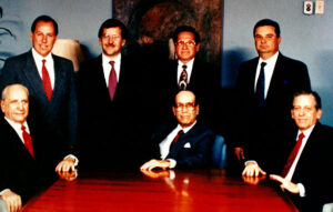 Primeros directores del Banco del Istmo. De pie: Alberto Valladarino, Jaime Alemán, David Dayán y Ricardo Pérez. Sentados: Alberto Arias, Sammy Lewis.