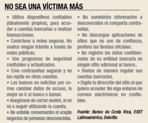 “En temas de seguridad, existe un compromiso en ambas vías: de la entidad bancaria y del cliente. El banco tiene la obligación de brindar un servicio seguro, así como los dispositivos para que el cliente los utilice en el momento de realizar las operaciones y que estas sean seguras. El cliente, por su parte, tiene el deber de utilizar adecuadamente los dispositivos de seguridad, resultando de vital importancia el resguardo de las claves, tarjeta dinámica, tokens, etc.”, explica Isabel Cortés, directora ejecutiva de la Asociación Bancaria Costarricense (ABC).