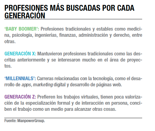 trabajo requerirá de un nuevo esquema de juego y los empleadores necesitarán la agilidad y el talento para triunfar en el mercado laboral. En este sentido, las empresas deberán integrar las diferentes generaciones y aprovechar el potencial de cada una de ellas para lograr los objetivos organizacionales”.