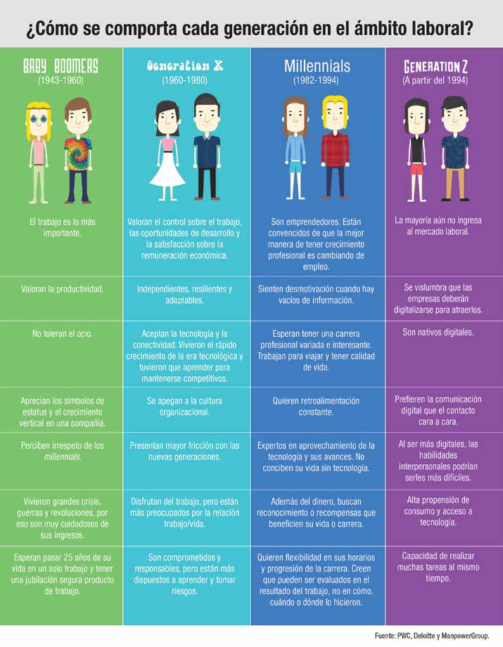 Actualmente, los llamados baby boomers, la generación X, los millennials o generación Y y la generación Z confluyen en un mismo ámbito laboral y esto podría impactar a las compañías de Centroamérica y el mundo, pues son diferentes entre sí y están marcadas por hechos trascendentales ocurridos en su época de nacimiento y crecimiento. Esto les proporciona características únicas.