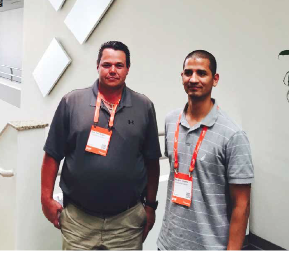Jean Paul Suger, vicerrector administrativo, y Eduardo Corpeño, director de Laboratorios de Electrónica, Telecomunicaciones y Mecatrónica de Fisicc, de la Universidad Galileo, durante el congreso en Austin.