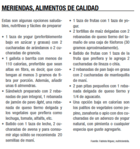 Las expertas concuerdan en que la merienda debe ser un aperitivo pequeño pero con alimentos de calidad; es decir, que proporcionen nutrientes necesarios para el organismo, que a su vez tengan la menor cantidad de calorías vacías como el azúcar y las grasas saturadas.