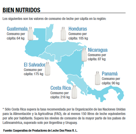 Francisco Arias, gerente sénior de Relaciones Corporativas y Ganaderas de la Cooperativa de Productores de Leche Dos Pinos R. L., explica que Centroamérica es una región atractiva para la producción y consumo lácteo, ya que a pesar de que la producción lechera ha venido creciendo a una tasa superior a la media mundial, los niveles de consumo siguen estando bajos, pues la FAO recomienda al menos 150 litros de leche equivalentes por año por habitante.