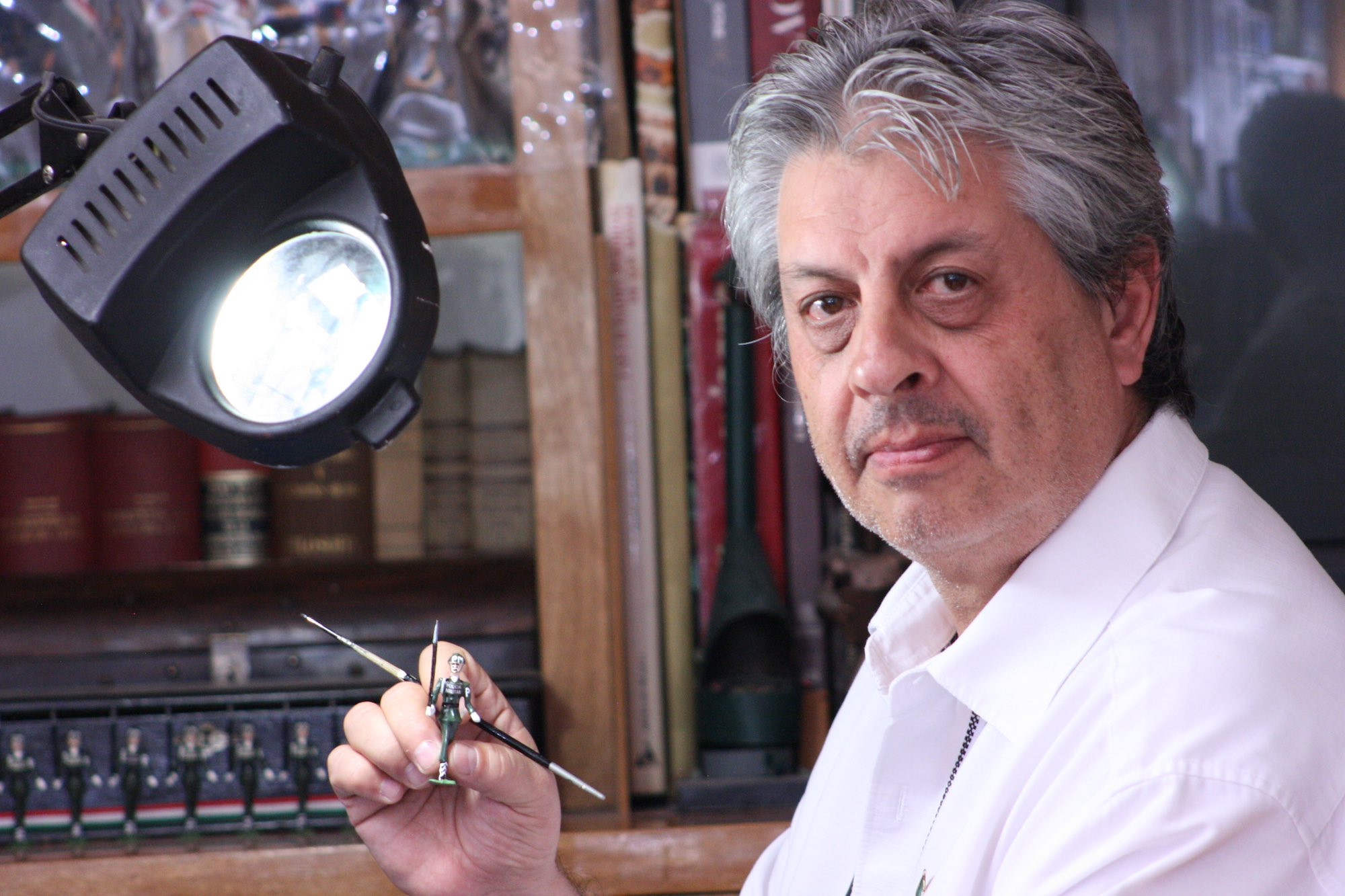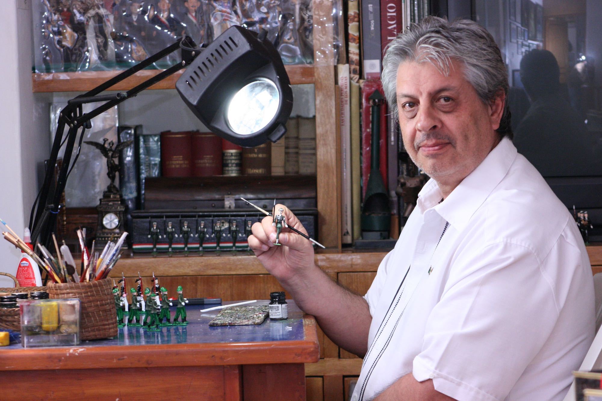 Actualmente, alejado del trabajo de oficina, dedica los siete días de la semana a leer y pintar soldados de plomo que miden entre tres y 15 centímetros en el taller de su casa.