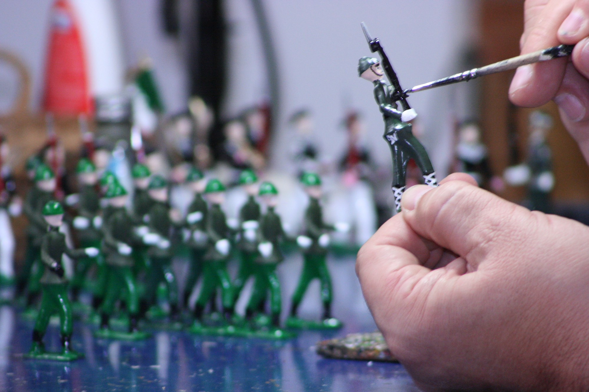 También, los adquiere de personas que tienen moldes de figuras de plomo ya listas para pintar. Luego las transforma para que luzcan en diferentes posiciones o expresiones, como por ejemplo, haciendo el saludo militar o portando el fusil o espada de diferentes formas.