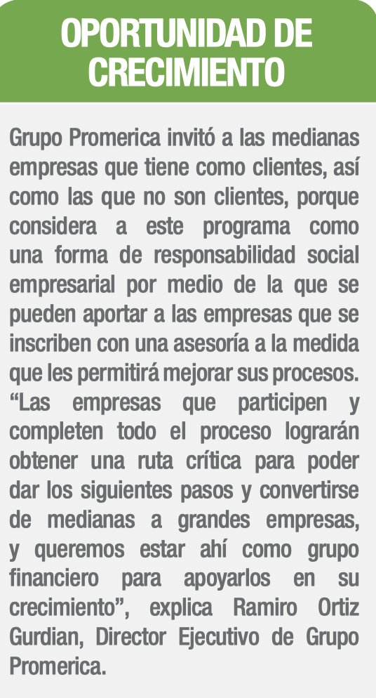 “Cuando Deloitte nos presentó el programa vimos dos cosas inmediatamen te: la necesidad que tienen las medianas empresas de ser asesoradas para crecer, desarrollarse y ser más competitivas; así como que el programa calza con nuestra visión que tenemos como Grupo, bajo la cual creemos que todas las personas y empresas de nuestras comunidades deben de superarse y tener el éxito que se merecen”, explica Ramiro Ortiz Gurdian, Director Ejecutivo de Grupo Promerica.