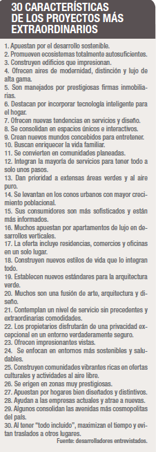 Es ahí donde las firmas inmobiliarias concentran sus mayores apuestas para ofrecer arquitectura visionaria (mucho de ello en construcciones verticales), con un nivel de servicio sin precedentes y extraordinarias comodidades.