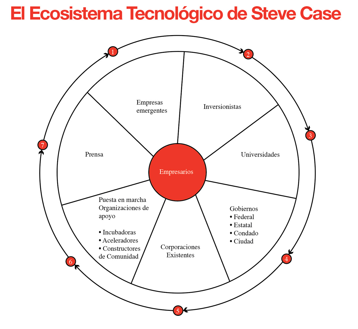 Steve Case nos describe con detalle en su libro, el ecosistema que se necesita para que un startup o empresa emergente crezca y se desarrolle. Él reconoce que la creación de valor de las startups puede suceder en cualquier parte del mundo donde exista un ecosistema que comprenda de emprendedores, inversores, universidades, gobiernos, corporaciones existentes, organizaciones que dan soporte y la prensa local.