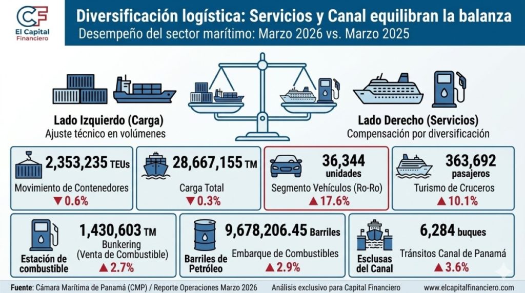 Según los datos oficiales de la Cámara Marítima de Panamá (CMP), el sector experimentado una ligera desaceleración técnica en el movimiento de carga contenerizada; sin embargo, esta fue contrarrestada por un repunte vigoroso en el segmento de vehículos y el dinamismo del turismo de cruceros, factores que inyectan optimismo a la cadena de servicios auxiliares.