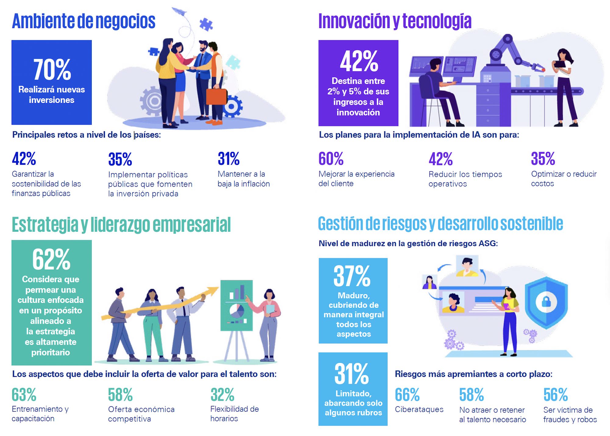 En materia de innovación y tecnología, las empresas de la región enfocarán sus estrategias en mejorar la experiencia del cliente (57%), incrementar la productividad y las ventas (54%) y desarrollar nuevos productos o servicios (50%). Para lograr que estas estrategias sean efectivas, las organizaciones implementarán herramientas como: data & analytics (70%), aplicaciones y nube (61%cada una), e inteligencia artificial analítica y generativa (47%). Esta última con un enfoque particular en la experiencia del cliente (60%), la reducción de tiempos operativos (42%) y la optimización y reducción de costos (35%).