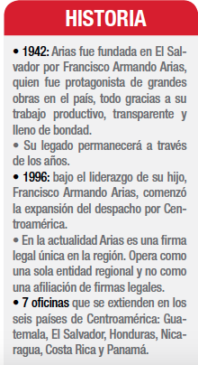 Arias es una reconocida firma legal de origen salvadoreño con más de siete décadas de experiencia y exitosas operaciones. Su fructífera trayectoria y su amplio conocimiento, les ha permitido consolidar un alcance global a través de sus siete oficinas ubicados de manera estratégica, en cada uno de los países de América Central.