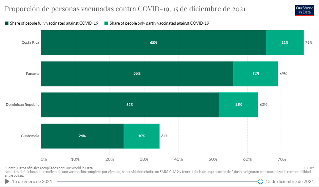 Según datos de la plataforma de la Universidad de Oxford (con datos oficiales de gobiernos y Johns Hopkins Coronavirus Resource Center) , en la región de Centroamérica y el Caribe, Costa Rica  está a la cabeza con un 65% de personas con el esquema de vacunación completo y un 11% con alguna dosis faltante; seguido de Panamá con un 56% de vacunados  y un 13% que ya inició su  inmunización;  después por República Dominicana con un 52% de vacunados totales y un 11% de vacunación incompleta, y por último Guatemala con un 24% de vacunados completos y un 11% incompletos.