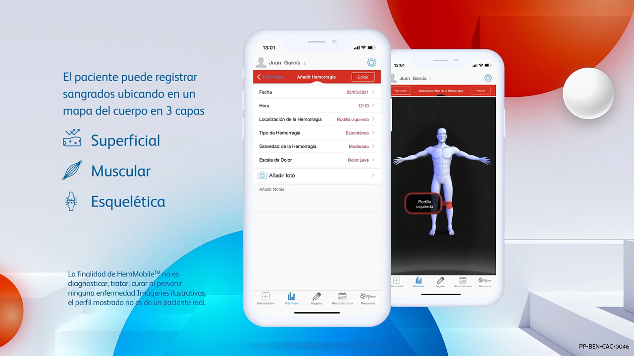 HemMobile™ CAC le permite a los usuarios registrar los sangrados por ubicación corporal, monitorear el suministro de factores de coagulación VIII o IX, registrar las infusiones rápido y fácilmente, generar informes para compartir con su equipo de tratamiento y configurar recordatorios para actividades importantes, como citas médicas, entre otras funciones.