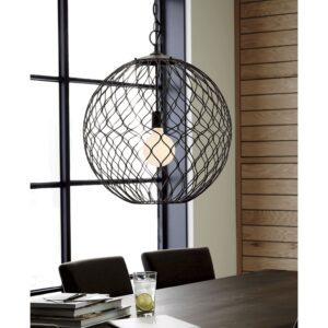 La lámpara Hoyne diseñada con una esfera de alambre de hierro con un acabado de acero galvanizado.
