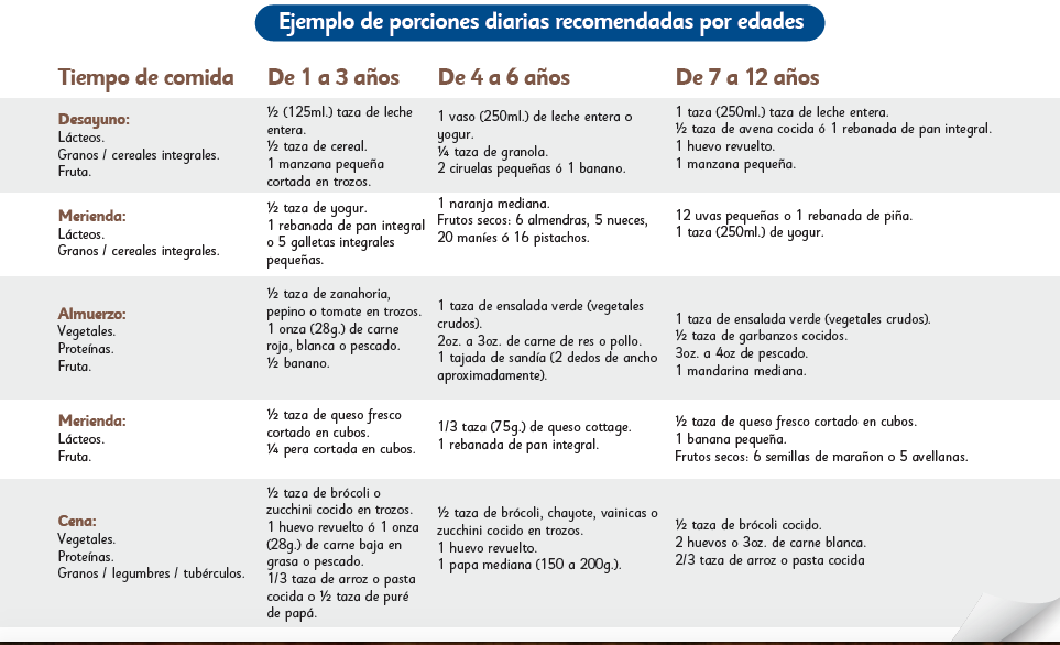 1. Vigile que su hijo realice entre 4 y 5 comidas al día: el desayuno, dos comidas principales y dos meriendas. Estas, en conjunto, deben aportar el 100% de los nutrientes diarios requeridos.