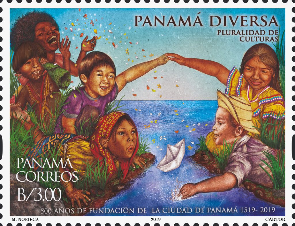 En la tercera estampilla aparecen los distintos pueblos originarios que desde hace siglos configuran y enriquecen el acervo cultural panameño, con una alegoría al futuro representada en cinco niños físicamente dispares ataviados con también diferentes vestimentas tradicionales y jugando juntos en torno a un pequeño estanque. Es el retrato del panameño con sus distintos rostros compartiendo el mismo amor por lo común y lo propio.