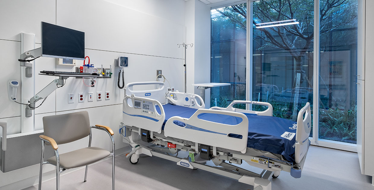 La torre del hospital incluye un departamento ampliado de Servicios de emergencia, 24 camas de unidades de cuidados intensivos (UCI), 26 camas médicas/quirúrgicas y de telemetría para pacientes de oncología y cuidados intensivos, y 24 camas médicas para UCI. Varios elementos de diseño para respaldar la seguridad, la comodidad y la experiencia del paciente incluyen el acceso a la luz natural en toda la instalación para respaldar un entorno de curación, camas de hospital de vanguardia con herramientas de administración visual y estaciones de enfermería ubicadas entre las habitaciones de los pacientes. Las estaciones de computadoras dedicadas se encuentran en las habitaciones de los pacientes para que los cuidadores brinden un fácil acceso a los registros de salud electrónicos.