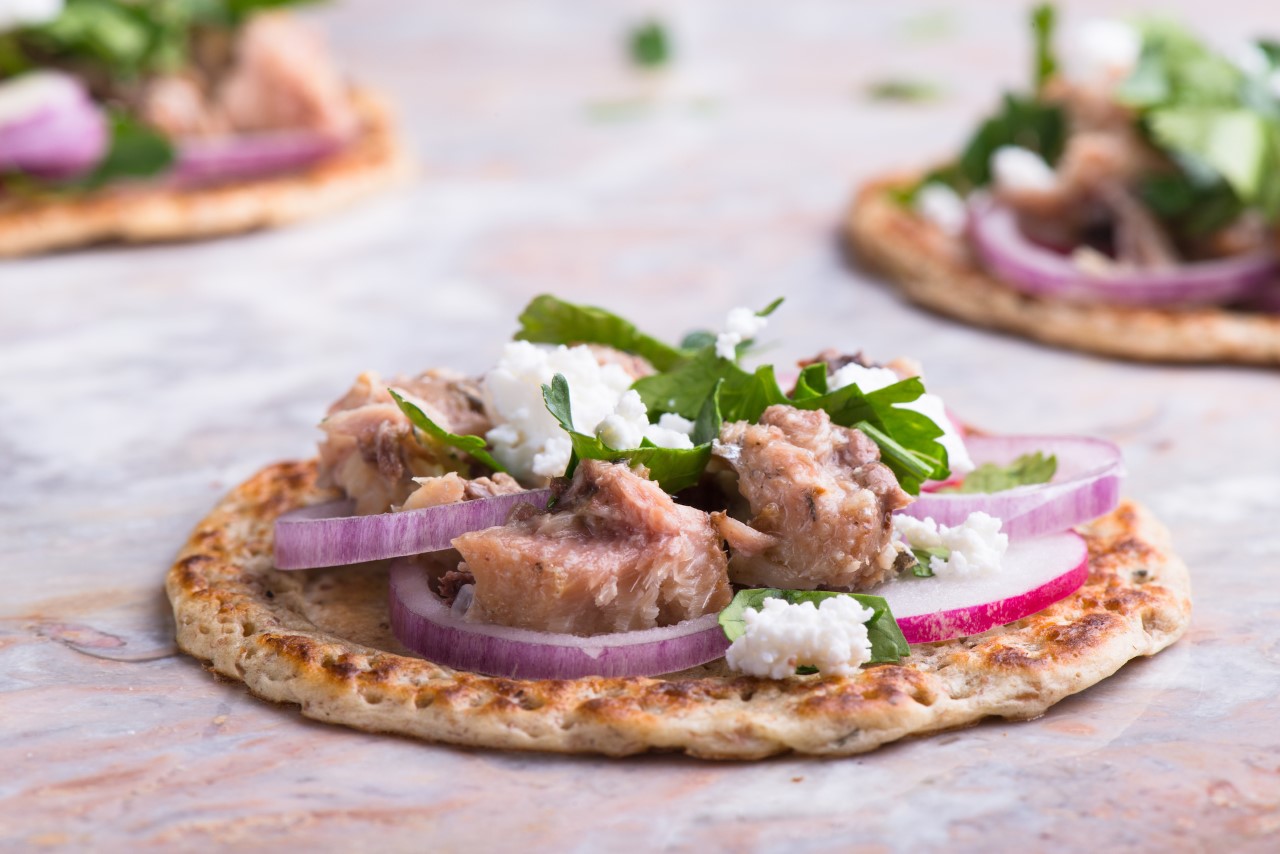 Agrega la mezcla de frijoles en diferentes platos, cúbrela con el atún y perejil.