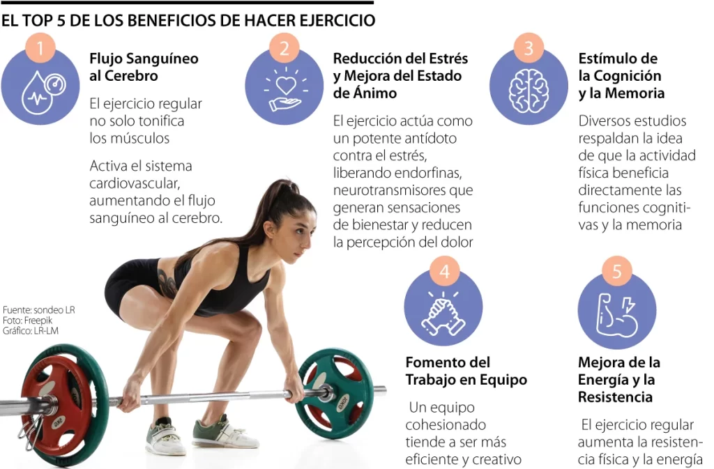 Por último, el quinto puesto es para la mejora de la energía y la resistencia. El ejercicio regular aumenta la resistencia física y la energía, permitiendo a los empleados afrontar las demandas laborales con mayor vitalidad y persistencia. Esta mejora en la resistencia física se traduce en una mayor resistencia mental, lo que resulta en un rendimiento sostenido a lo largo del día laboral.