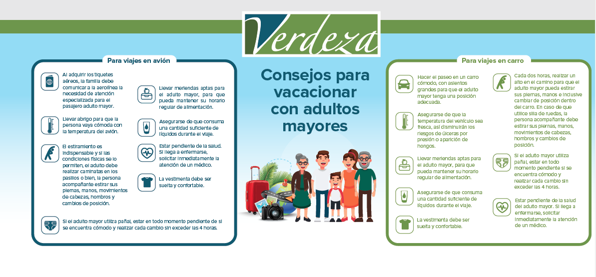 La psicóloga María Fernanda Murillo, supervisora de actividades en Verdeza, residencial Premium especializado en el adulto mayor, explica que, ante esta realidad nacional, es muy importante que cuando las familias planean sus vacaciones incluyan en los planes a un adulto mayor y consideren ciertos aspectos básicos para organizar un paseo cómodo para el abuelo o abuela.