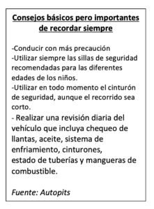 Gabriel Hernández, Supervisor Técnico de Autopits explicó que es fundamental verificar los implementos de seguridad del vehículo, cinturones, asientos bien sujetados, sillas o buster. Además, deben cerciorarse que el vehículo se encuentre en perfecto estado (llantas, frenos, luces, entre otros).