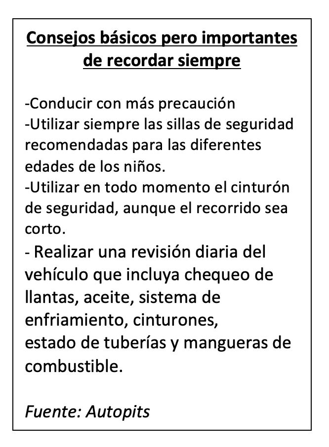 Hernández aconseja además ser muy cuidadosos con los vehículos para garantizar la seguridad de toda la familia en todo momento a través de revisiones diarias del vehículo de las llantas, del aceite, del sistema de enfriamiento, los cinturones y el estado de las tuberías y mangueras de combustible.