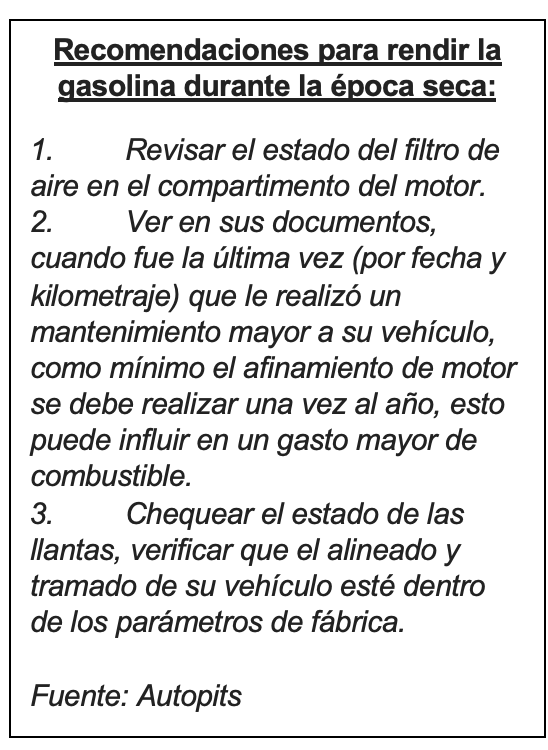 Durante la estación seca es común que el consumo de combustible tienda a incrementar entre un 15% hasta un 40%; un aumento que puede obedecer tanto a factores técnicos como a otras circunstancias.
