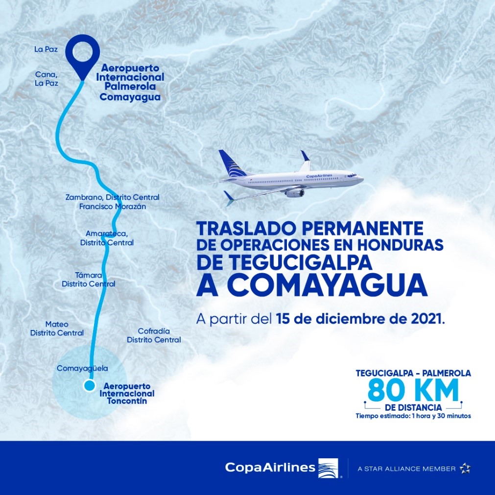 Copa Airlines anuncia el inicio de sus operaciones de vuelo en el Aeropuerto Internacional de Palmerola en Comayagua, que servirá la ciudad de Tegucigalpa, Honduras, a partir del 15 de diciembre de 2021.