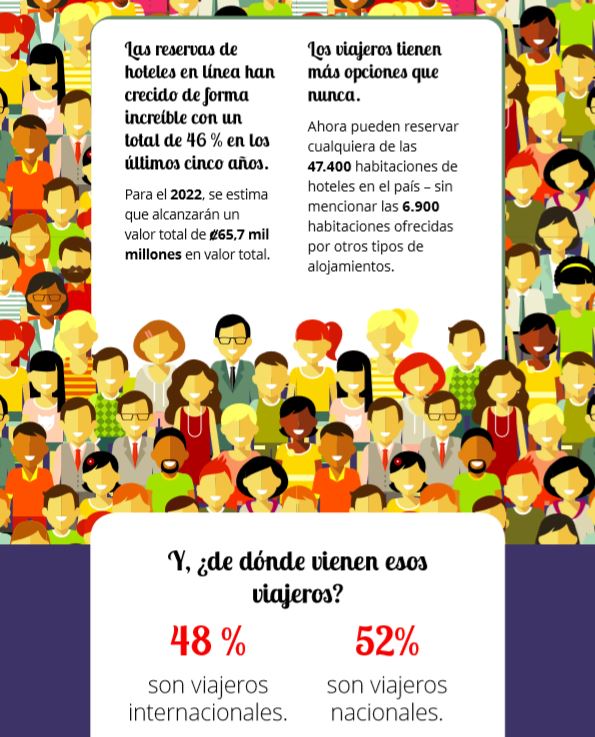 La plataforma líder de reservas hoteleras en la nube, SiteMinder, reveló durante su participación en la WTM Latin America 2018 en São Paulo, el crecimiento y las oportunidades que tiene Costa Rica en cuanto a reservas de hoteles. Solamente en los últimos cinco años, las reservas en línea han crecido en un 46%, y para el 2022 se estima que alcanzarán un valor total de ₡65,7 mil millones.