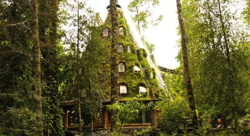 Montaña Mágica Lodge – Chile. Este hotel simula a una montaña con ambiente “green design”, cuenta con una cascada artificial de agua que cae desde la cumbre, se puede practicar canopy, ciclismo, trekking o senderismo. Además, tiene acceso al volcán Mocho Choshuenco.