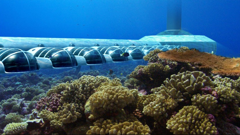 Poseidon Undersea Resort – Islas Fiji. Este hotel es para los amantes del mar, ubicado a 30 metros de profundidad del Océano Pacífico, cada suite cuenta con su propio jardín de corales con vista de la vida submarina. Además, cuenta con 2 restaurantes, cine, biblioteca, gimnasios, campo de golf, tenis y piscinas.