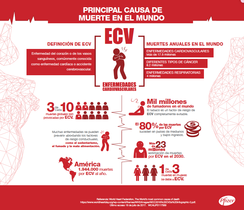 Hoy 29 de septiembre se conmemora el Día Mundial del Corazón, por tal motivo la empresa Pfizer, quiere compartir las principales causas de las enfermedades cardiovasculares (ECV)  que son la principal causa de muerte en todo el mundo. Cada año mueren más personas (17.3 millones) por ECV que por cualquier otra causa.