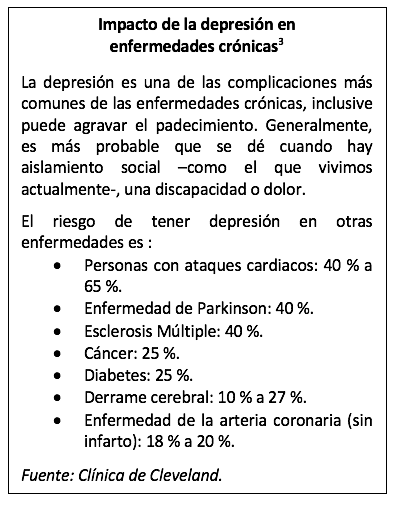 Adultos mayores y personas con enfermedades crónicas como diabetes, esclerosis múltiple, artritis reumatoide, mal de Parkinson, enfermedad coronaria, cáncer, obesidad e hipertensión, entre otras, son más propensos a sufrir depresión y este riesgo se ha intensificado, en los últimos meses, debido al COVID-19.